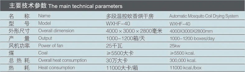 WXHF-40多段温控蚊香烘干房是本公司于2006年5月为蚊香烘干设计制造的生产线,居目前国内水平。该生产线具备烘干产量大、能耗小、自动化程度高、操作简便等优点,已在江苏三笑集团有限公司、安徽六安正峰日化有限公司、江西山峰日化有限公司、江西安福超威日化有限公司、广东中山揽菊制品有限公司=福建蛙王日化有限公司、元龙(福建)日用品有限公司、福建金鹿日化股份有限公司、福建安鹿卫生用品有限公司、福建鑫业工贸有限公司等企业投入使用、为蚊香生产企业节省生产成本,提升市场竞争力。