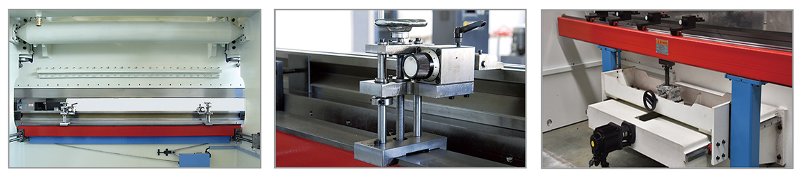 ◆ 选用两台W67(Y)系列同规格主机,配置双击联动同步装置 ◆ 双击联动可加工特长工件 ◆ 多台机床可同时单独使用,提高生产效率。 ◆ 机床配有挠度补偿机构 ◆ 同步机构采用机液伺服和机械挡块。 ◆ 机械挡块和后挡料架置采用自动数控调节。